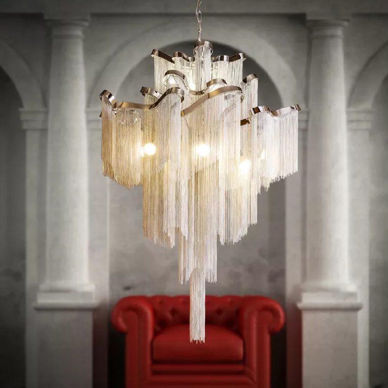 The LAMP COZY Stream lighting fixture features an undulating, nickel-plated frame. From this frame, several kilometers of metal chain descend, creating a cascading design. These tiered chains interact with light, projecting a distinct visual effect within a room. The design emphasizes the physical characteristics of its materials to create an atmospheric light distribution.