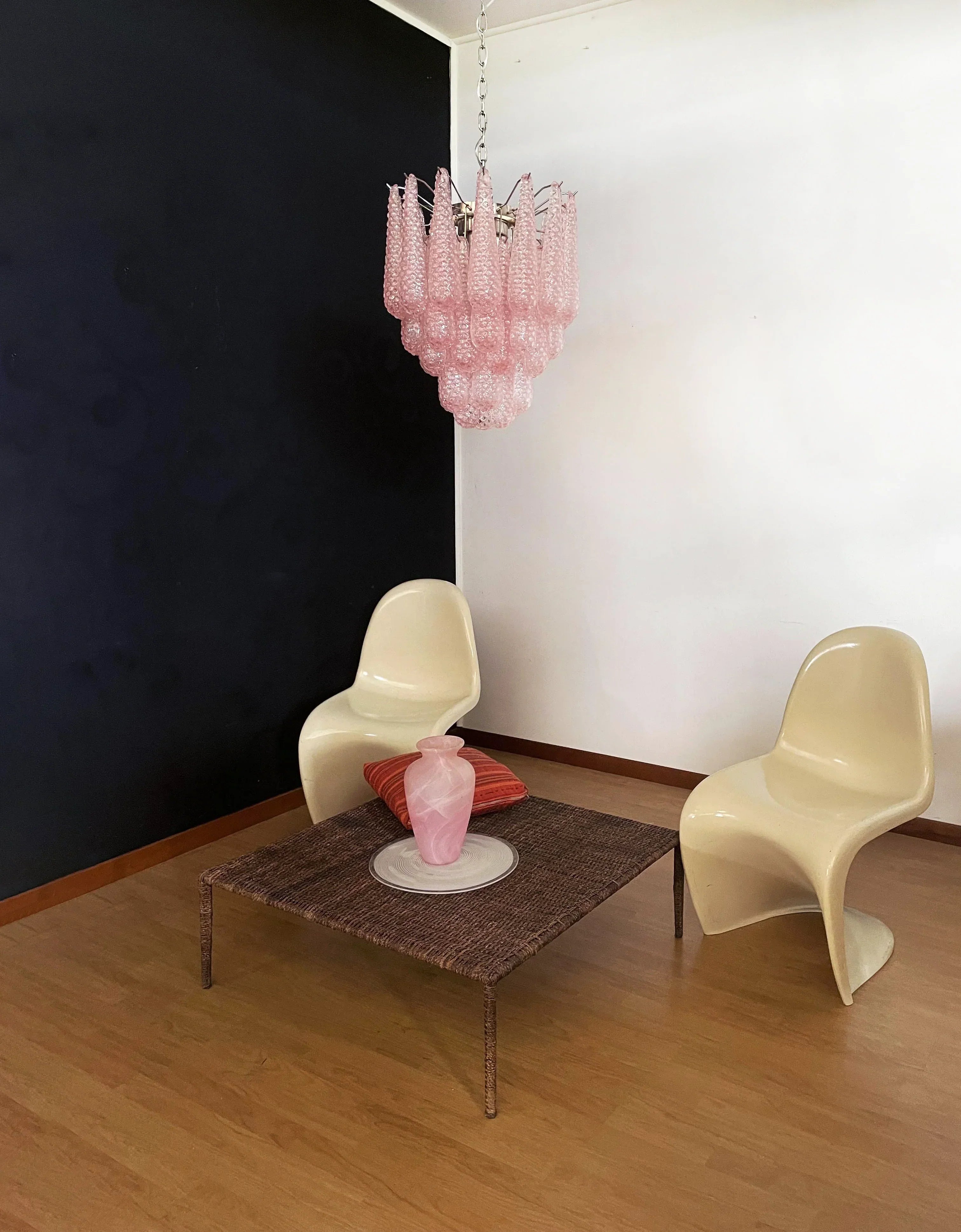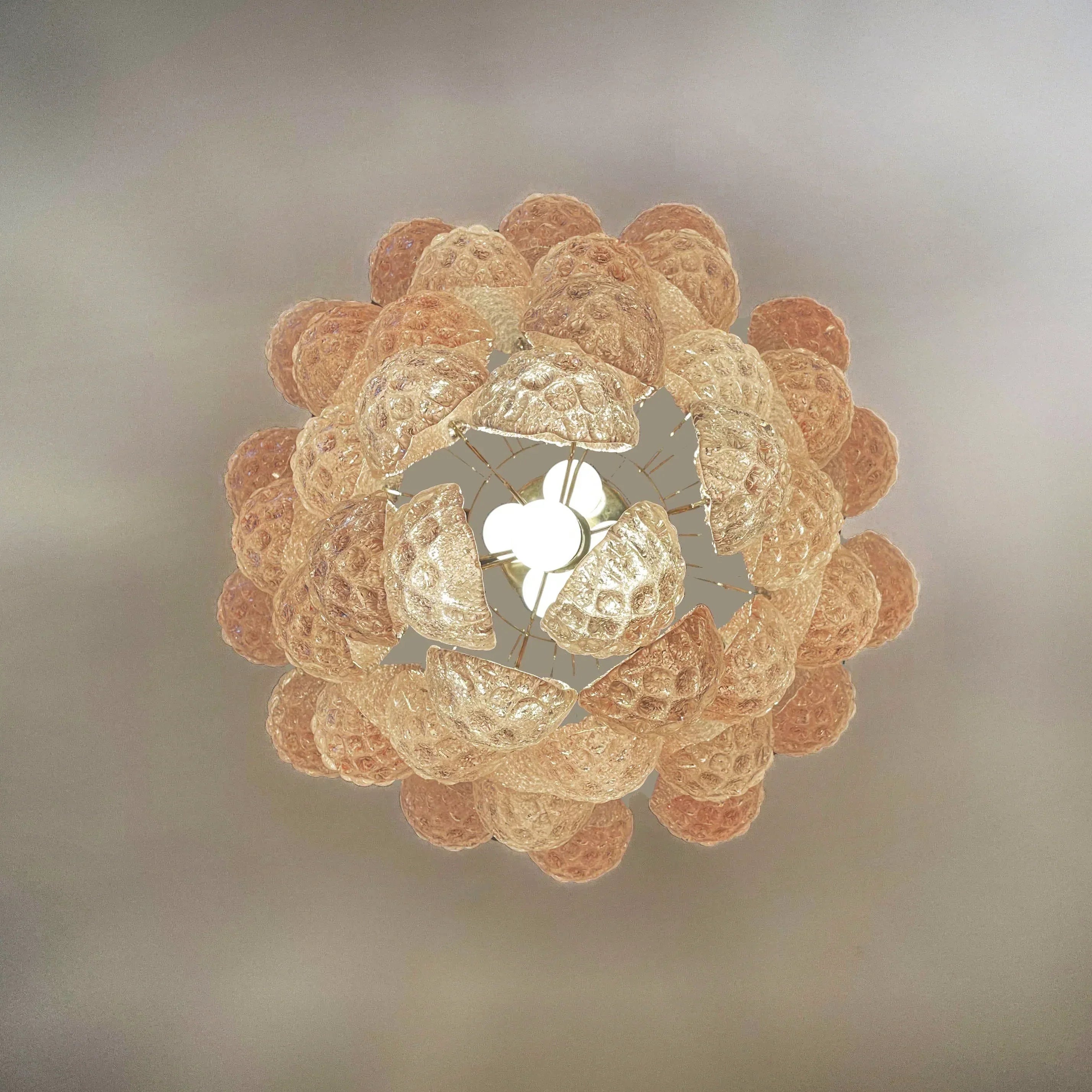 This vintage-inspired Murano pink glass petals chandelier adds a refined aesthetic to any home. It features beautifully crafted pink glass petals, meticulously arranged to create a captivating display of light and color. Each chandelier is handcrafted, emitting a warm and inviting glow suitable for enhancing various living spaces.