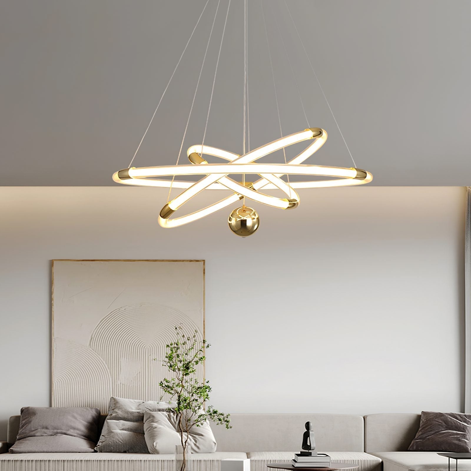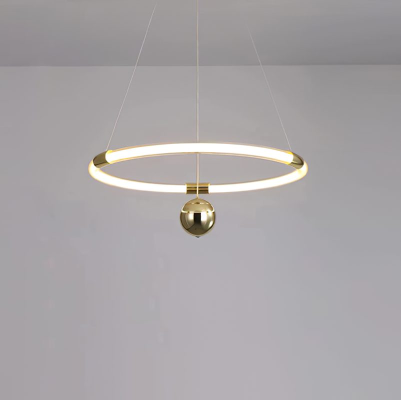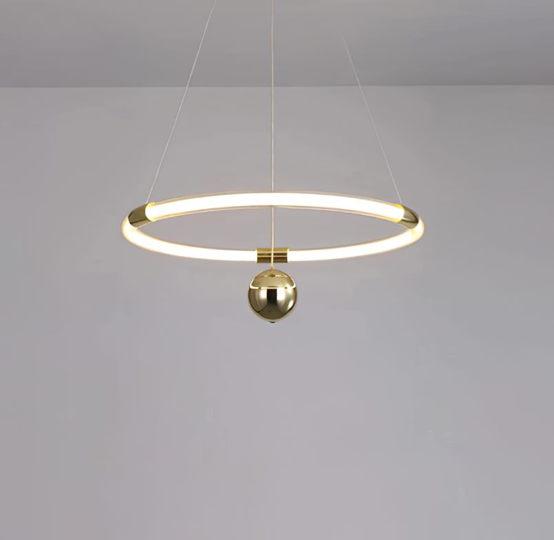 The Lasting Love Chandelier is crafted from high-quality metal and an acrylic ring, ensuring corrosion resistance and high light transmission. The structure is designed to be resistant to deformation, offering good load-bearing capacity. This chandelier is made with durable materials, designed for lasting performance. It features energy-efficient built-in LED pendant lights that cast a soft halo effect from an elegant gold ring, creating a clean and quiet ambiance.