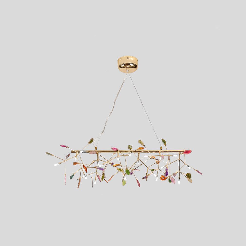 The Agate Flake Chandelier features natural onyx flakes suspended from metal arms, creating a distinct aesthetic for residential or professional environments. Each fixture incorporates natural agate stones, providing a varied display of color and texture.