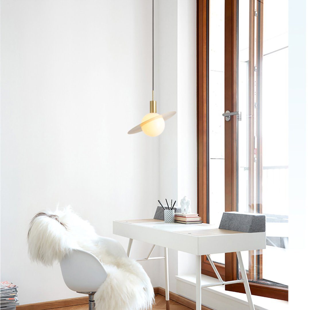 The LAMP COZY Saturn Pendant Light features a luminous sphere design, accented by a swiveling brass ring. This design element provides a dynamic visual, drawing inspiration from celestial bodies.